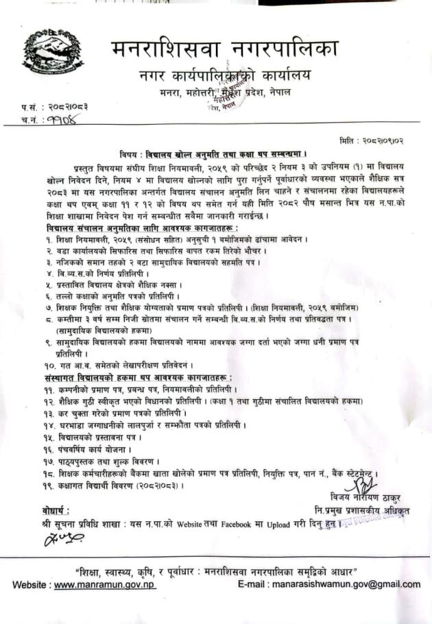 बिधालय खोल्ने अनुमति तथा कक्षा थप सम्बन्धमा